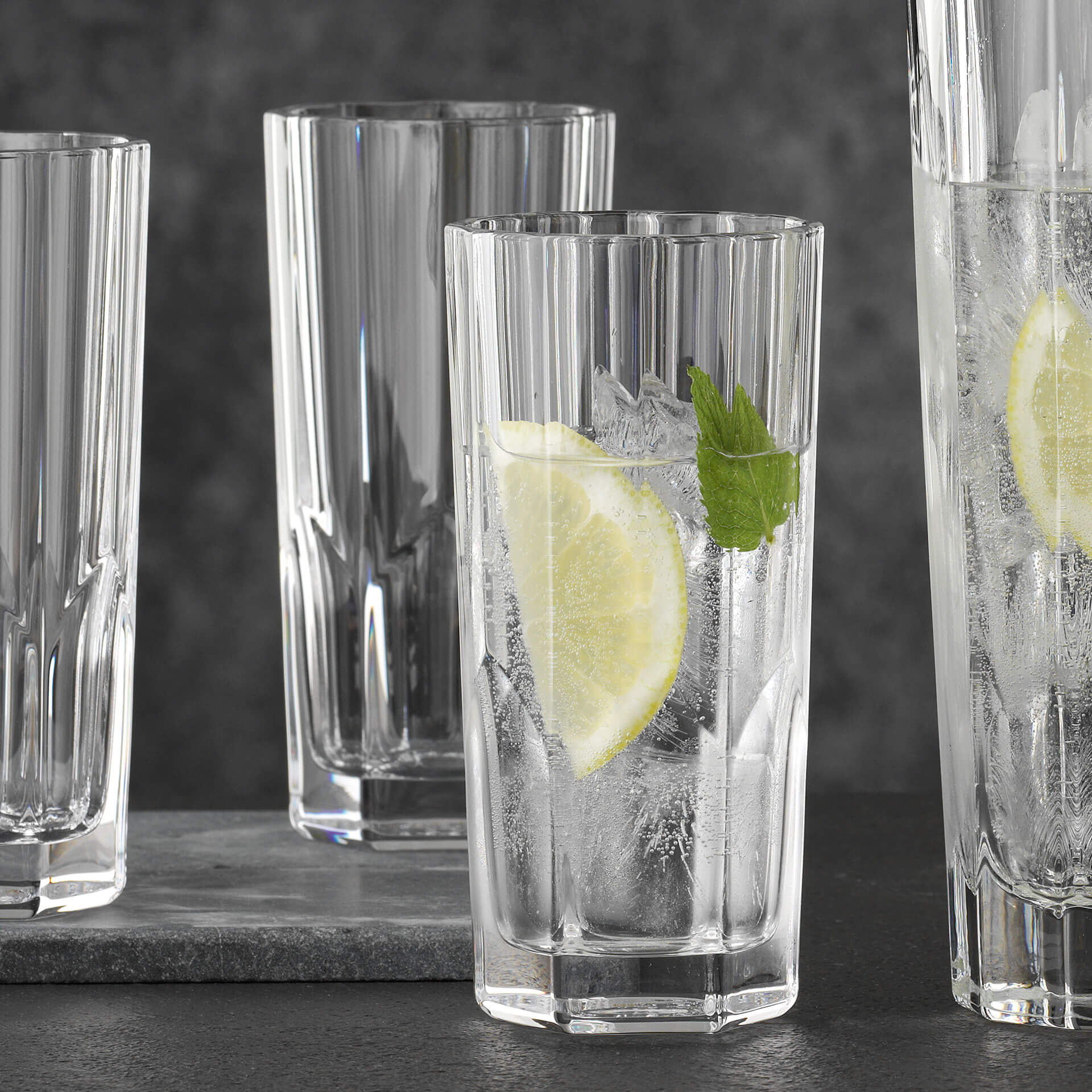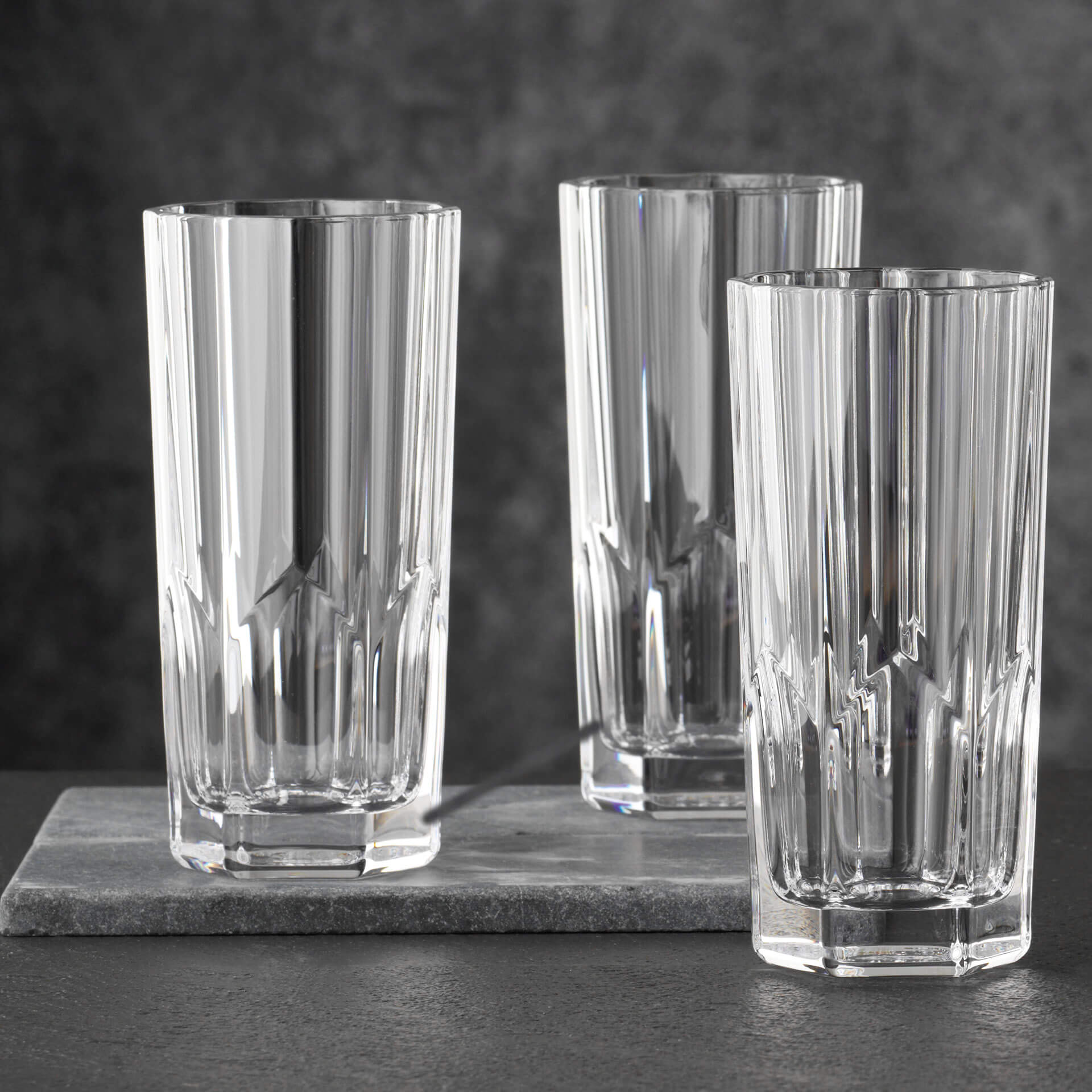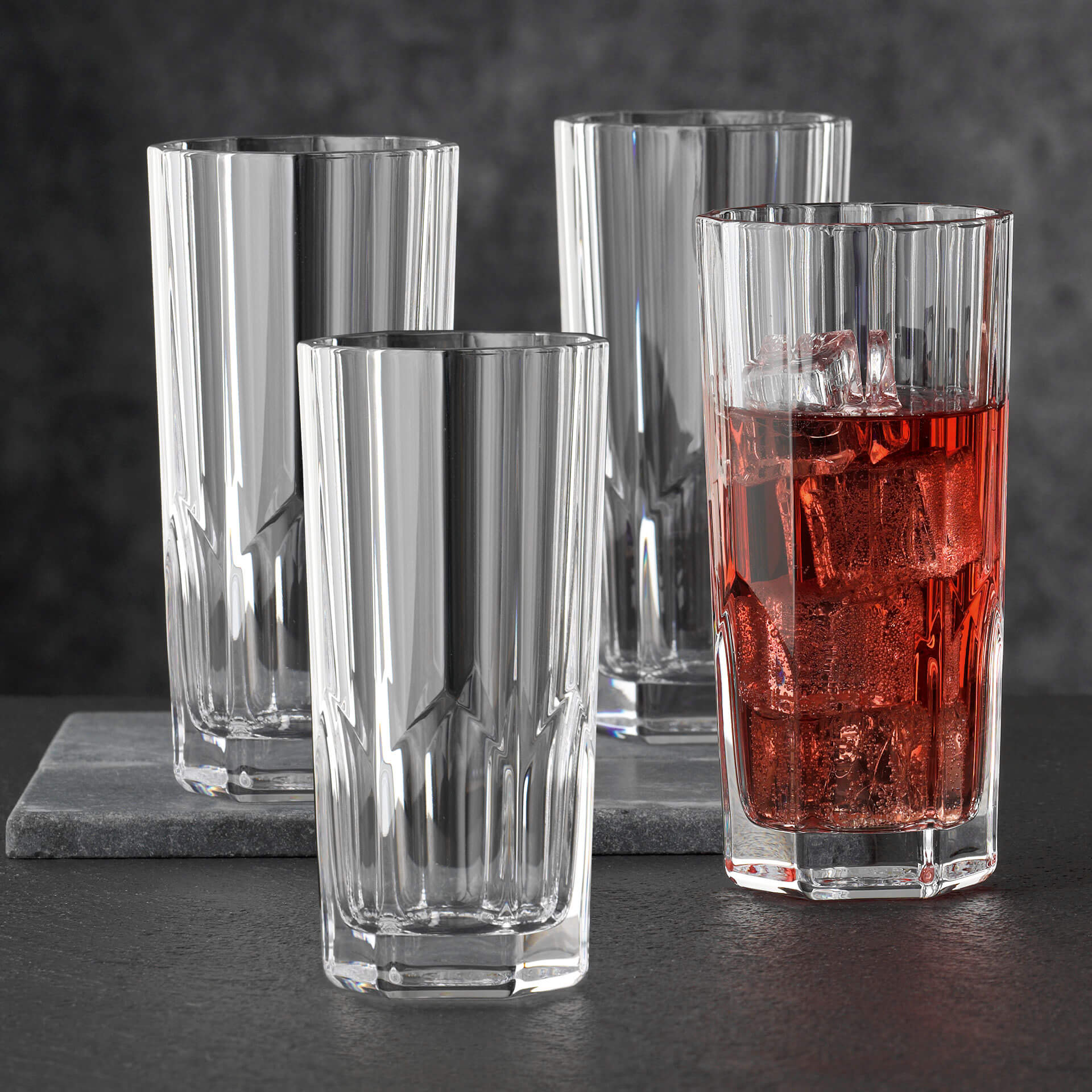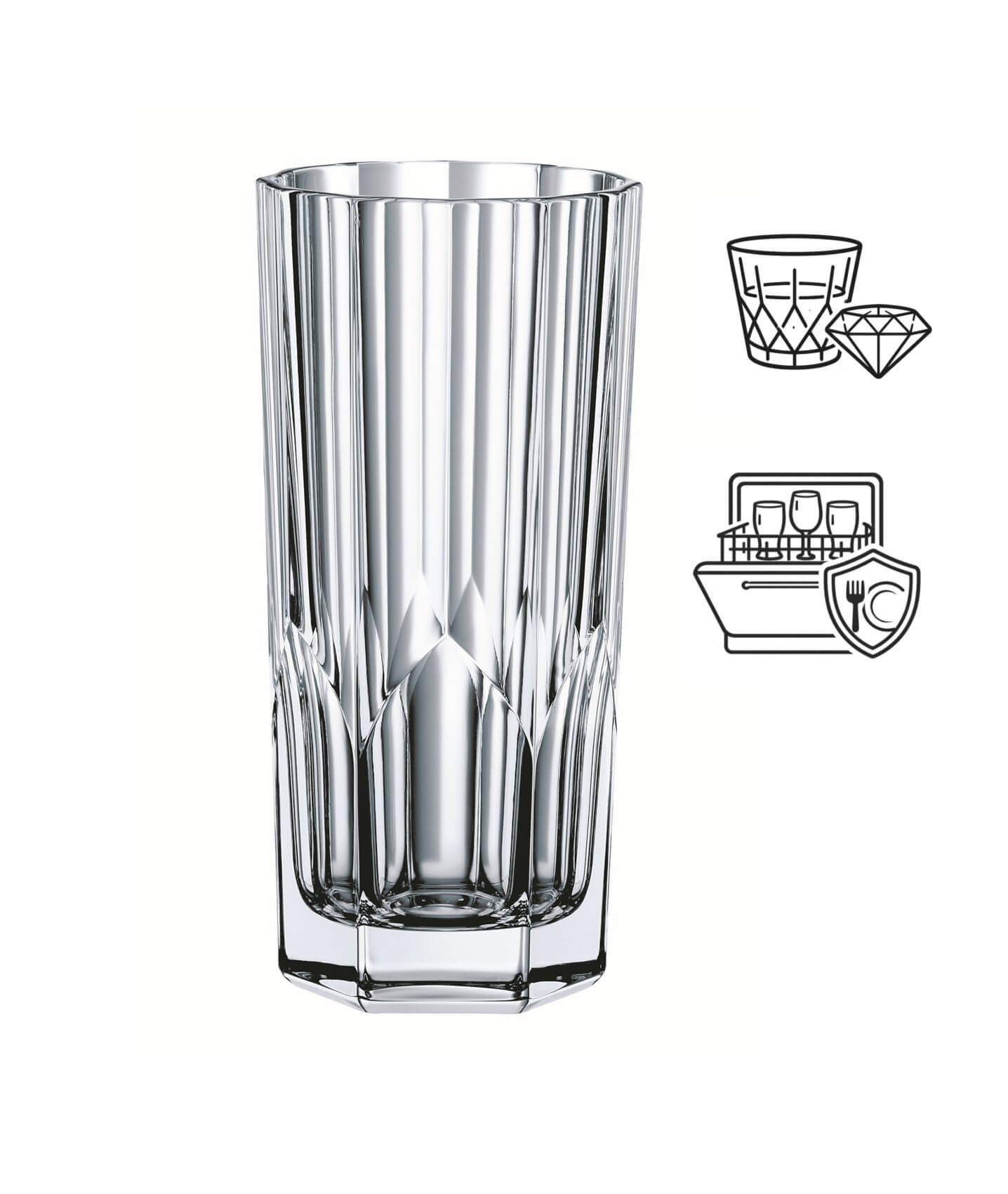 Die Außenseite dieses Longdrinkglases ist mit Ecken und Kanten versehen, die in die Höhe streben. Das verleiht dem Nachtmann-Glas ein markantes Aussehen, das zugleich zeitlos ist.