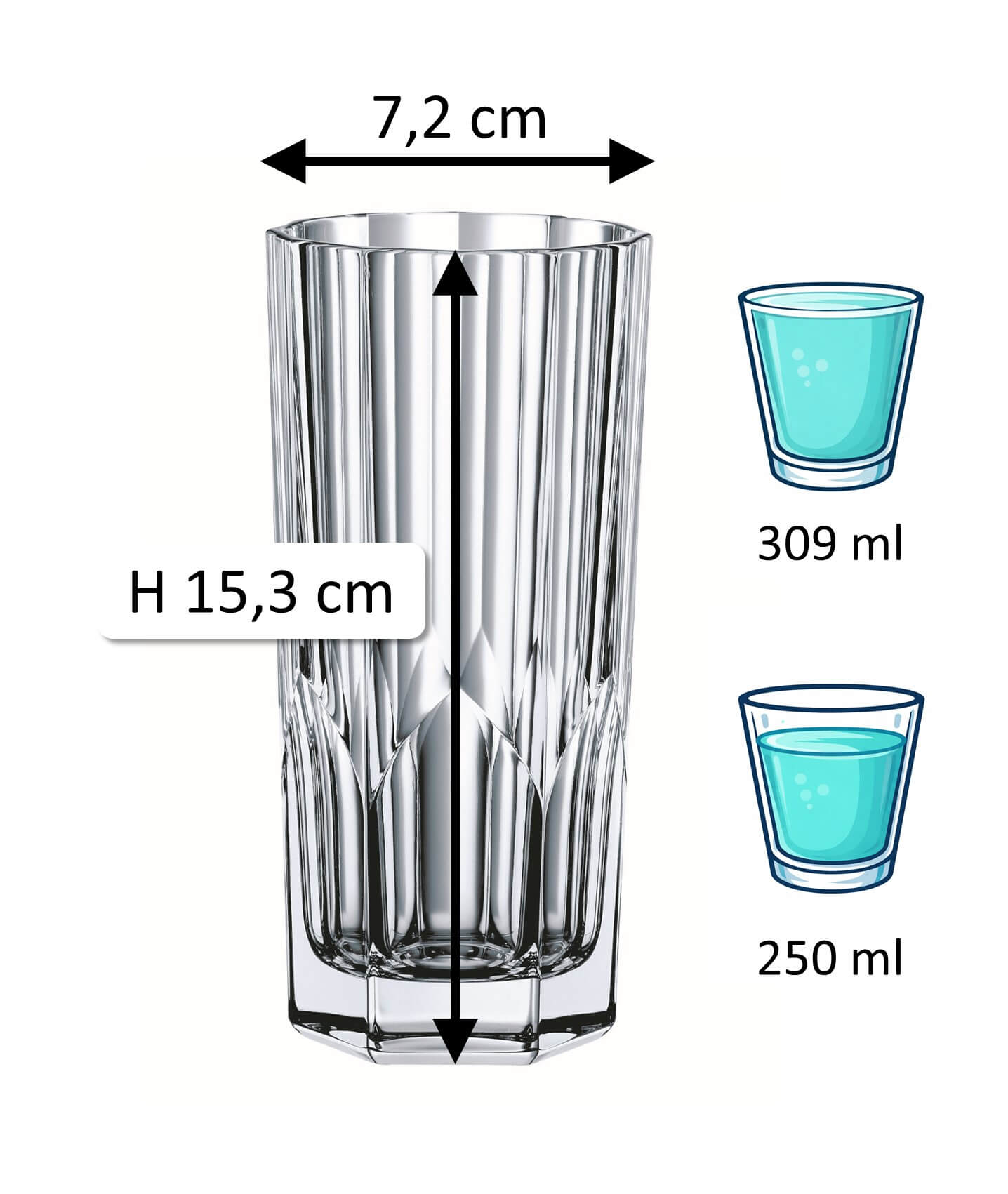1Hinweis: Das angegebene „Gesamtvolumen“ (auch Bruttoinhalt) eines Glases bezeichnet die maximale Flüssigkeitsmenge, die bis zum Rand eingefüllt werden kann. Im Gegensatz dazu beschreibt das „Füllvolumen“ (auch Nutzvolumen oder Ausschankvolumen) die praktisch verwendbare Menge. Beide Werte werden in ml oder l angegeben. Produktionsbedingt kann es zu einer Toleranz von ±5% kommen, was den branchenüblichen Standards entspricht und keinen Mangel darstellt.