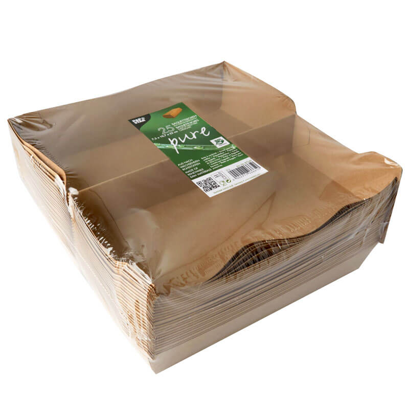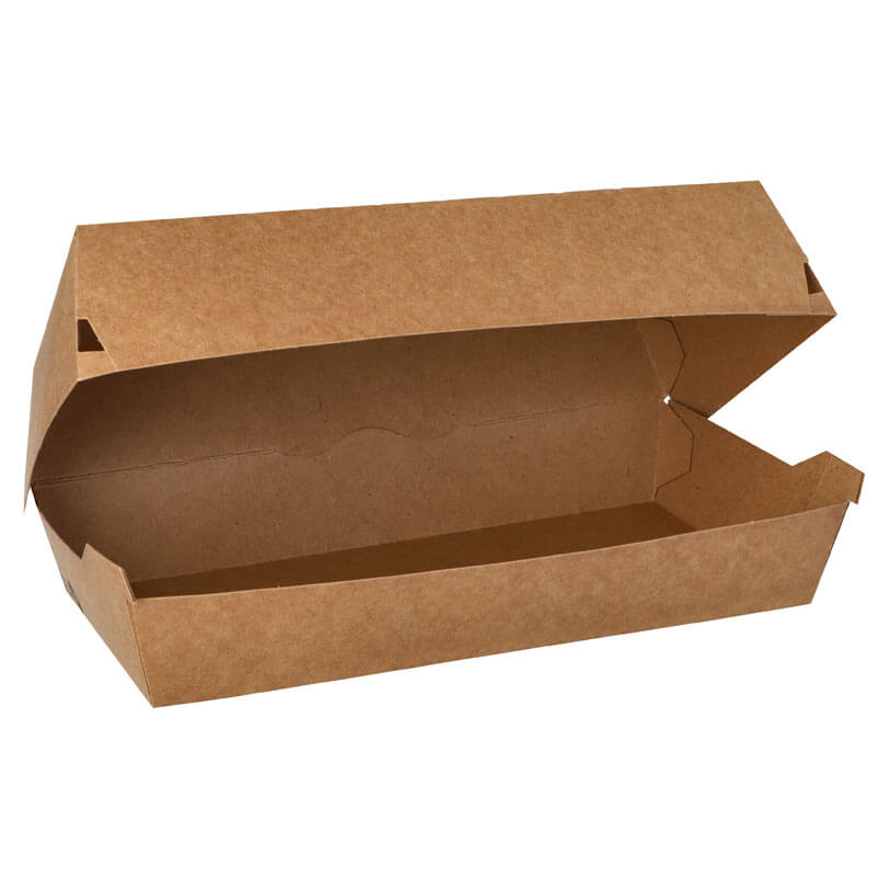 Die Baguetteboxen aus brauner Pappe sind für belegte Baguettes und andere Snacks konzipiert, welche eine längliche Schachtel benötigen. Dank der Bio-Beschichtung sind die To Go Verpackungen auch für fetthaltige Lebensmittel geeignet. Verschlossen wird die Baguettebox mit einem praktischen Klappdeckel.