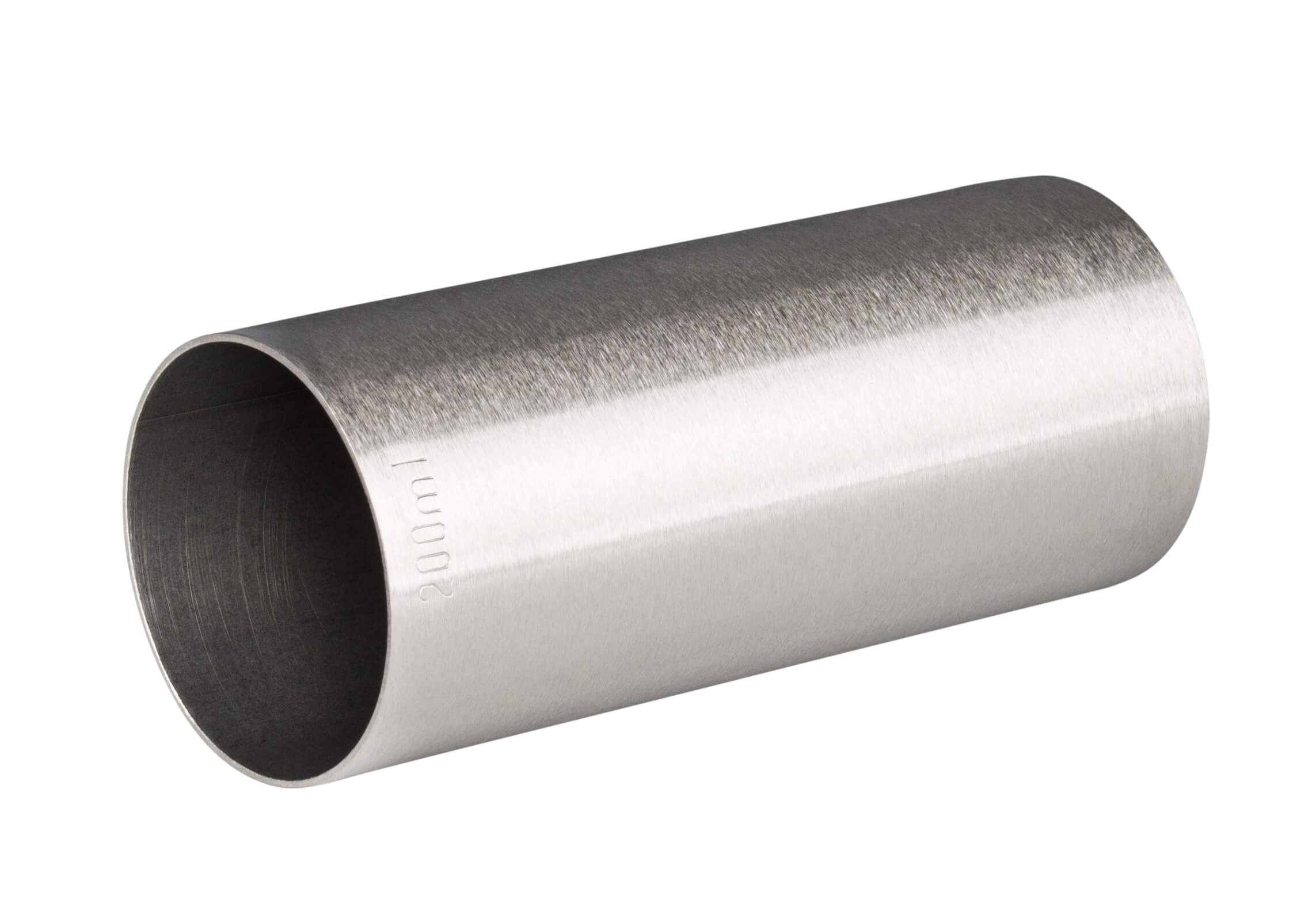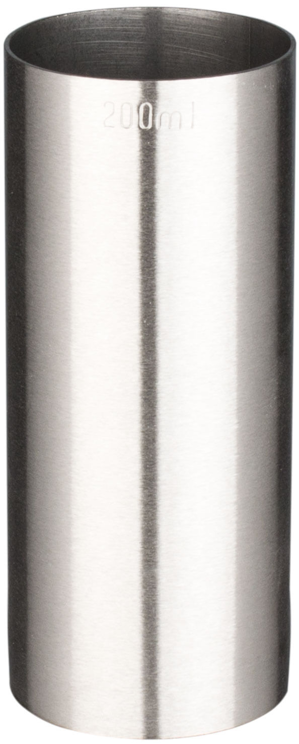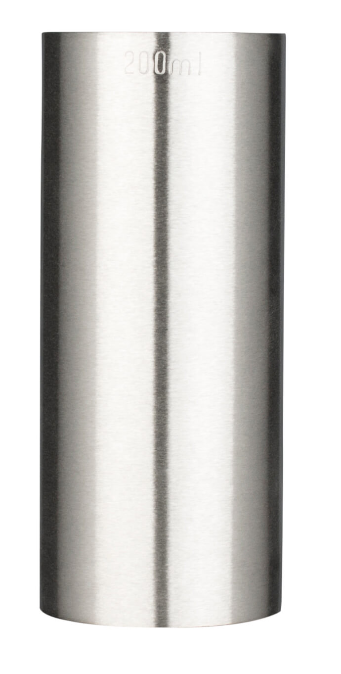 Bei diesem länglichen Zylinder aus Edelstahl handelt es sich um einen Messbecher mit einem Fassungsvermögen von 200ml. Das Barmaß ist für das Messen von Flüssigkeiten in der Küche, hinter der Bar oder im Restaurant geeignet. Kurz unterhalb des Rands auf der Außenseite ist die Einheit von 200ml unverkennbar eingraviert. So messen Sie flüssige Zutaten präzise ab.