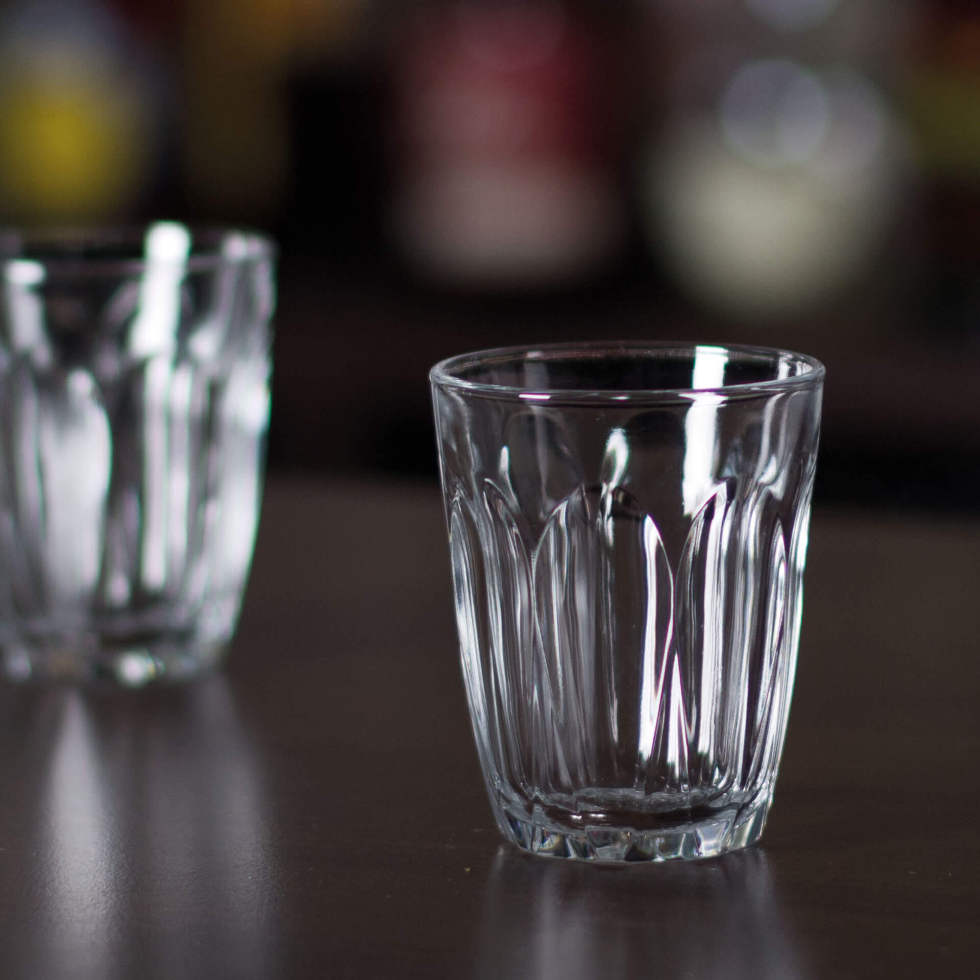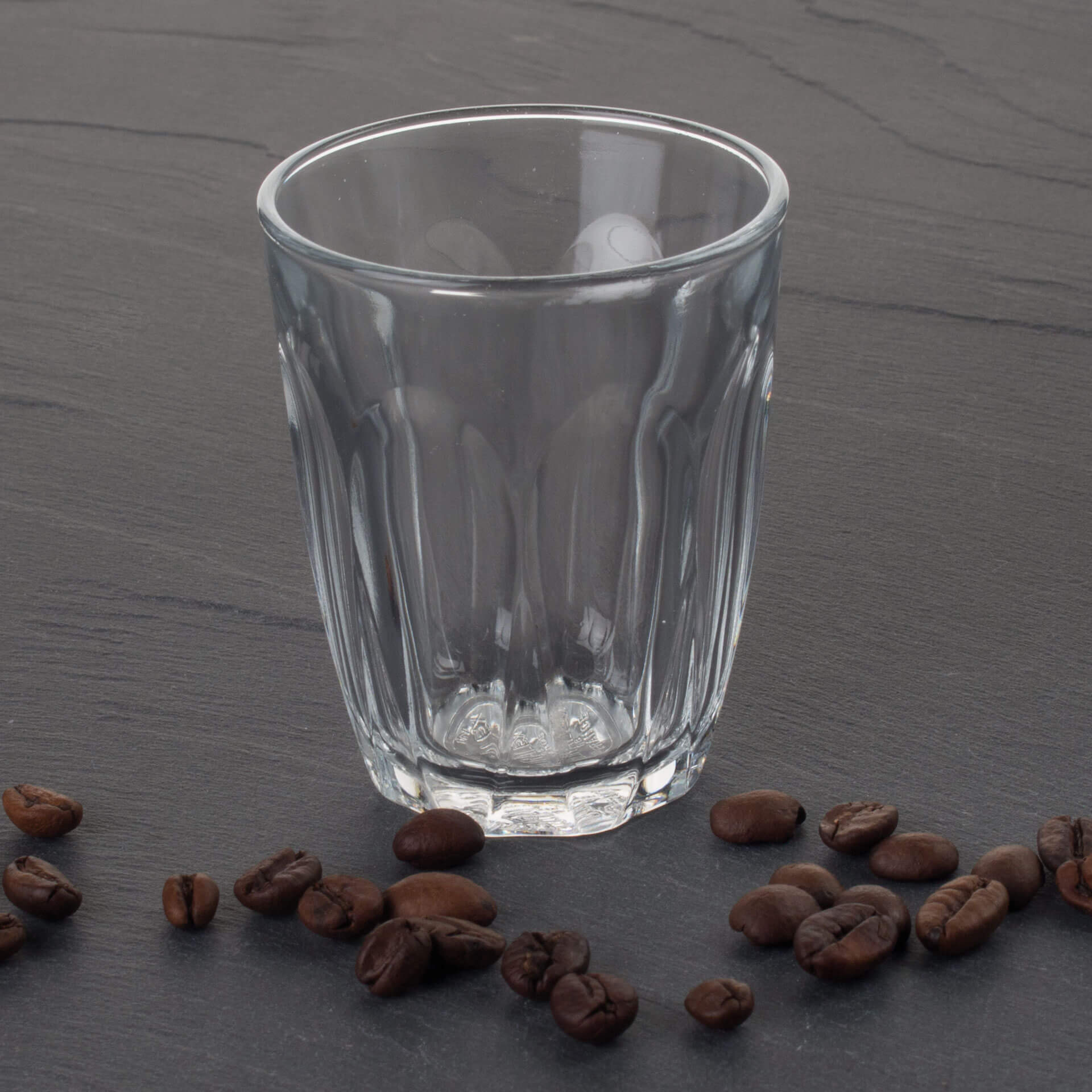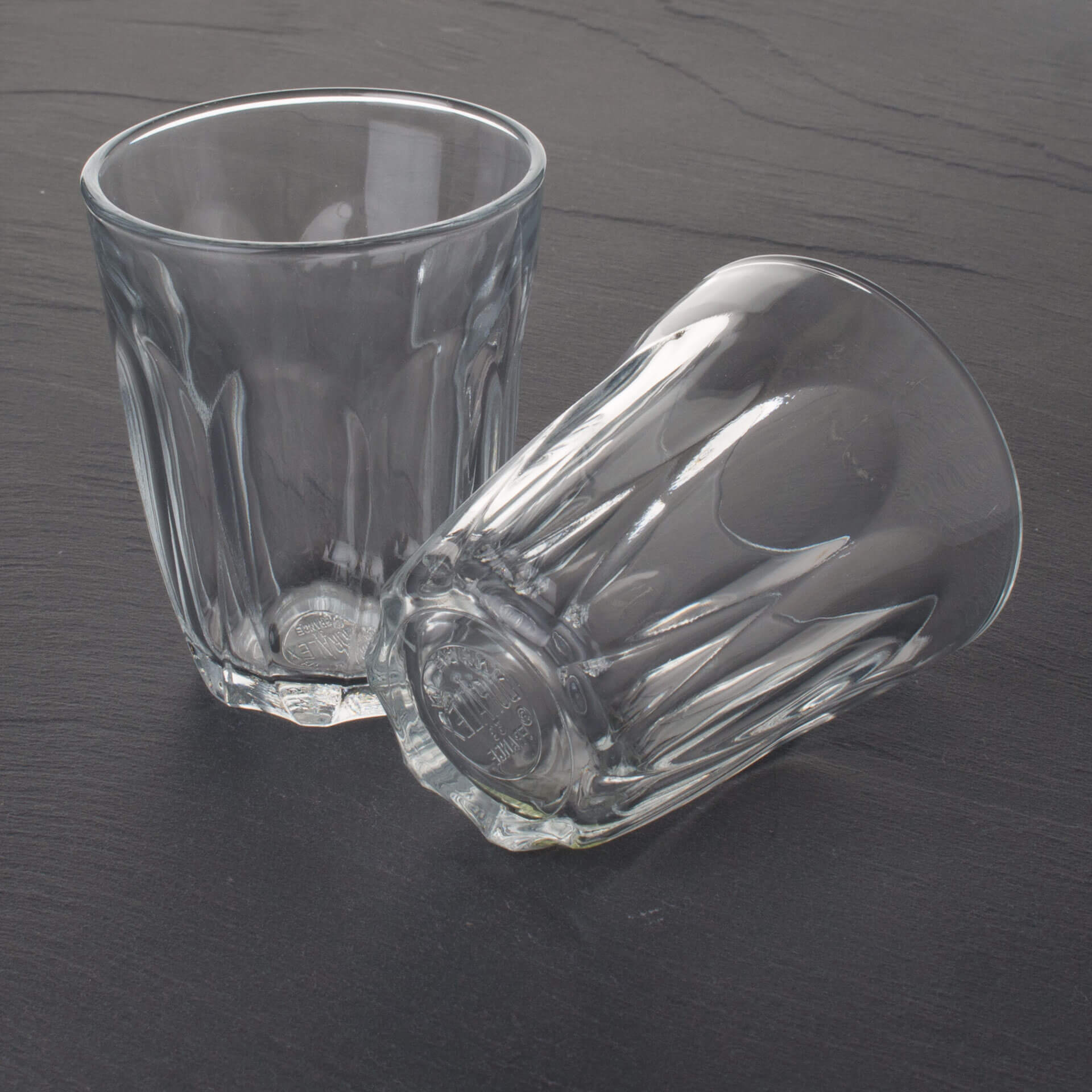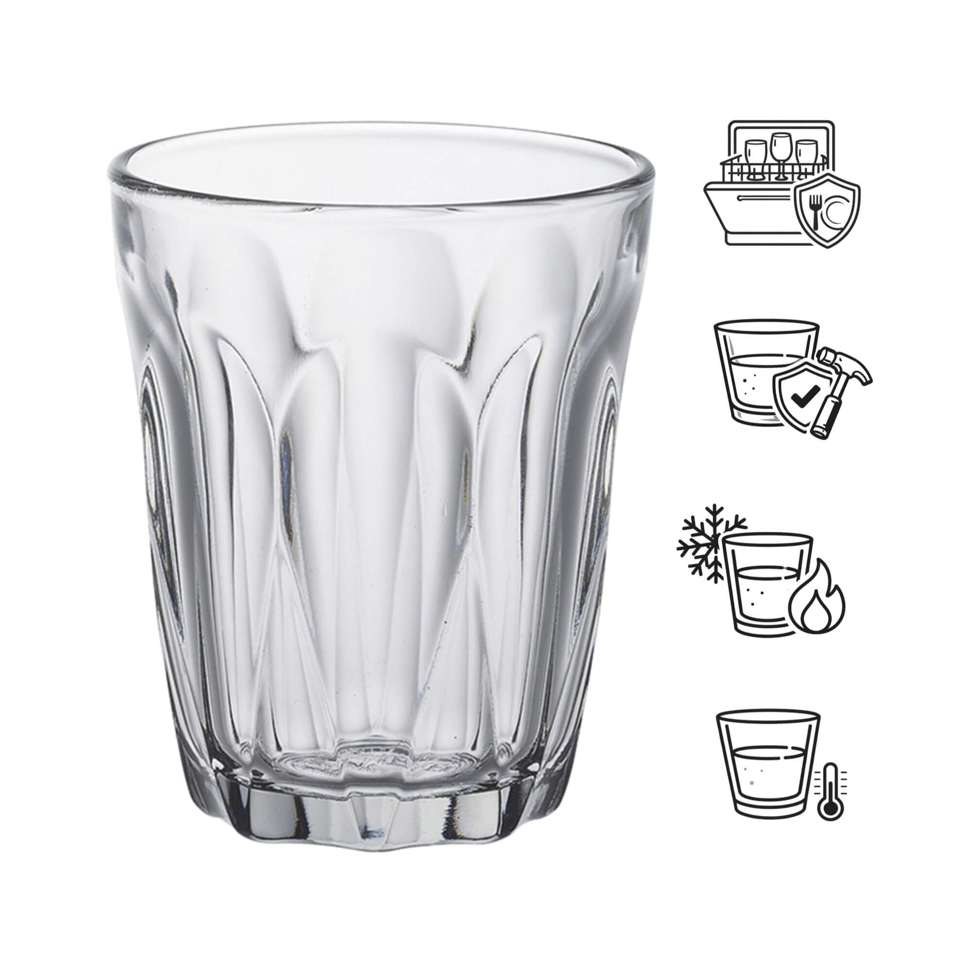 Dieser kleine Becher der Serie "Provence" von Duralex kann für verschiedene Zwecke genutzt werden. Ob als Side Water Glas, Espressobecher, kleines Teeglas, als Becher für Snacks oder als Aufsteller für Zahnstocher; dieses handliche Trinkglas macht sich im Haushalt, als auch in der professionellen Gastronomie nützlich. Da es aus gehärtetem Glas besteht, können Heißgetränke ohne Probleme darin serviert werden. Außerdem können die Gläser platzsparend ineinander gestellt werden, was für Restaurants und den Catering-Bedarf ideal ist. Die Außenseite des Bechers ist griffig strukturiert, wobei der Trinkrand wiederum kreisrund und eben gestaltet ist.