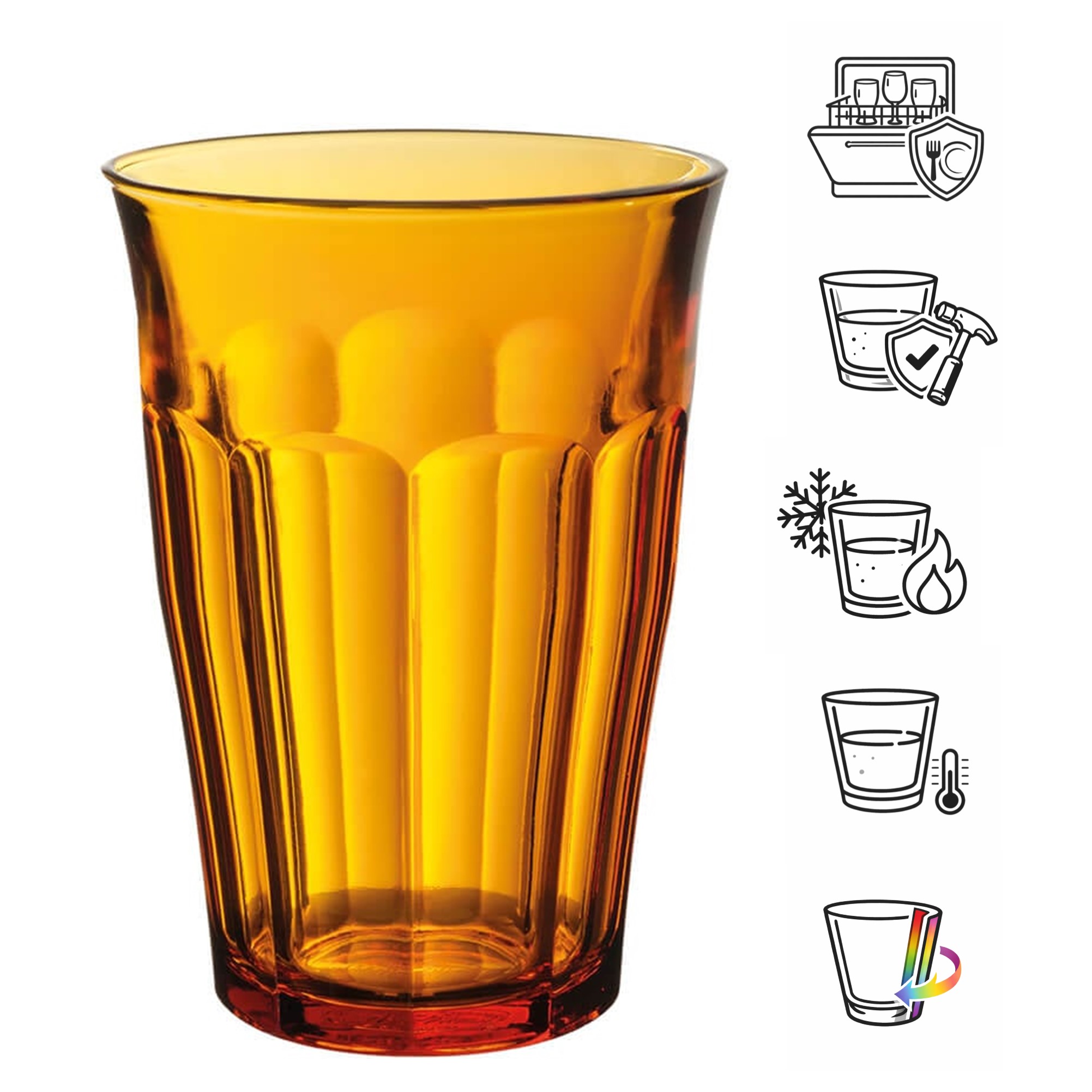 Dieses attraktive Becherglas aus der Picardie Serie von Duralex bringt Farbe auf den Tisch und an die Bar. Denn das 12,5cm hohe Trinkglas ist bernsteinfarben und besteht aus durchgefärbtem Glas, damit die Farbe auch bei der Reinigung in der Spülmaschine und beim täglichen Gebrauch erhalten bleibt. Da das Glas außerdem gehärtet ist, ist das Becherglas robust und langlebig.