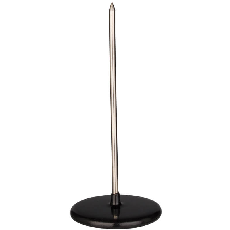 Auf diesem großen Bonspieß finden jede Menge Bons und Notizzettel Platz. Spieß und Basis sind zusammen etwa 17cm hoch, wobei der Spieß selbst 16cm lang ist und sein Durchmesser 5mm beträgt. Die 7,2cm breite Basis und ein Gewicht von insgesamt 140g sorgen dafür, dass der lange Bonspieß stabil steht. Die Basis ist komplett mit schwarzem Vinyl überzogen, sodass der Bonspieß nicht wegrutscht.