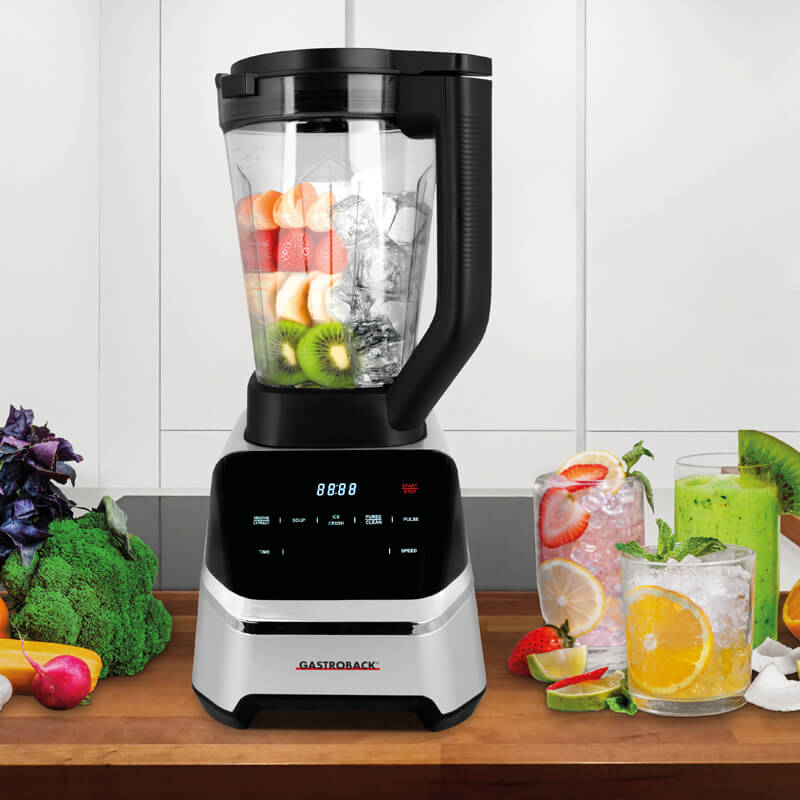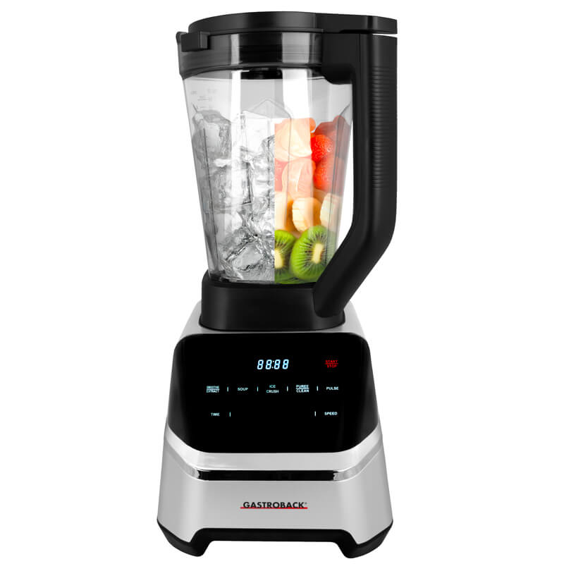 Der Design Multi-Power Standmixer Mix & Soup 2000 W von Gastroback ist ein kraftvoller Hochleistungs-Standmixer für die Zubereitung unzähliger kalter und heißer Speisen und Getränke. Dabei ist der Blender geräuscharm, leicht zu bedienen, langlebig und sicher.