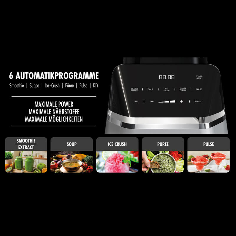 - Schnelligkeit: Smoothies in 45 Sekunden, Kaffeebohnen in 20 Sekunden, Crushed Ice in 12 Sekunden, Suppen in 7 Minuten (ca. 75°C)