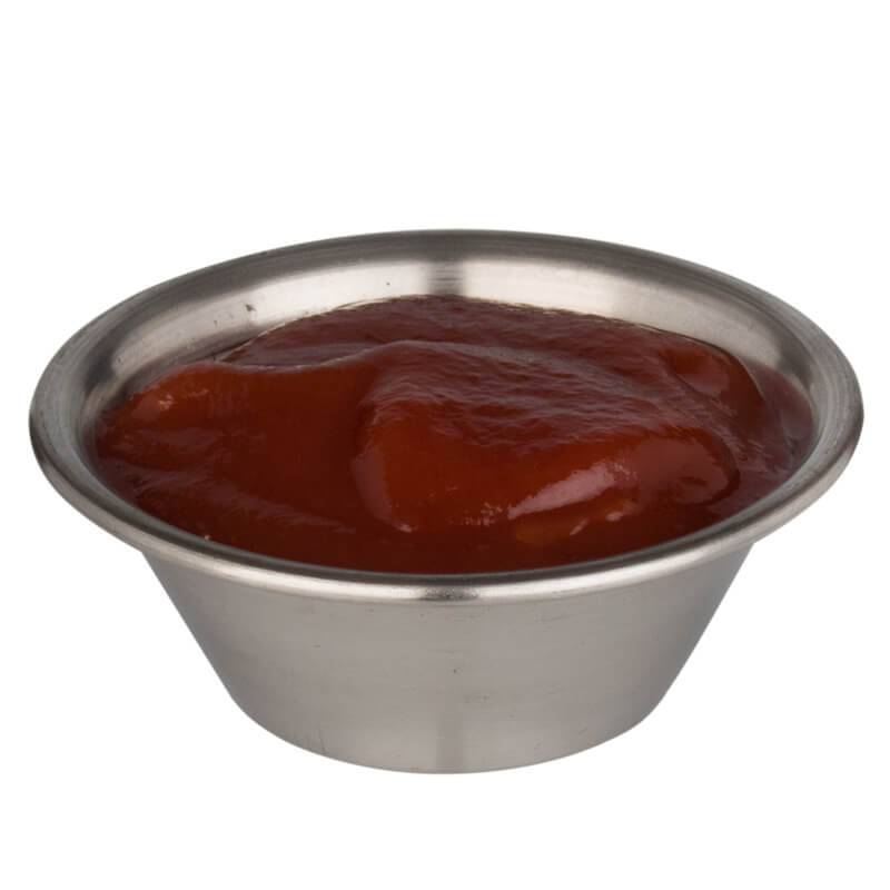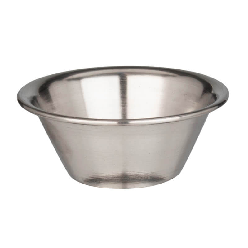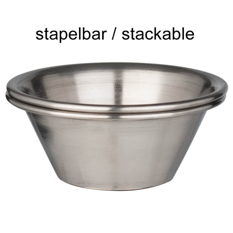 Diese kleine Dipschale mit 60ml Volumen eignet sich hervorragend für Saucen wie Ketchup, Mayonnaise oder Aioli. Da die Dip- und Snackschale aus Edelstahl besteht, kann sie hygienisch gereinigt werden und ist robust. Ein Rollrand sorgt dafür, dass der Rand nicht scharf sondern schön abgerundet ist. Außerdem lassen sich mehrere der Saucenschalen ineinander stapeln.