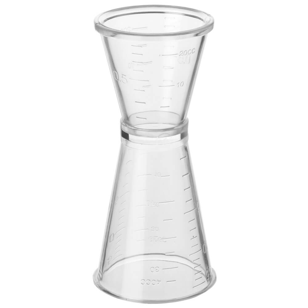 Dieses transparente Barmaß besteht aus Polycarbonat. Es ist bruchsicher, hitze- und kältebeständig (-40°C bis +100°C). Das leichte und robuste Barutensil liegt angenehm in der Hand, steht stabil und lässt sich gut kippen. Der X-förmige Doppelmessbecher hat abgerundete Ränder und ist mit Skalen in Millilitern (ml) und Flüssigunzen (oz) versehen. Die ml-Skalierung in 5ml Schritten geht bis 20ml auf dem kleinen und 40ml auf dem großen Becher. Die oz-Skalierung ist in 0,1 oz Schritten und geht bis 0,9 oz bzw. 1,5 oz. Darüber ist allerdings noch Platz, so dass der kleine Becher bis zum Rand gefüllt etwa 30ml fasst und der große etwa 50ml.