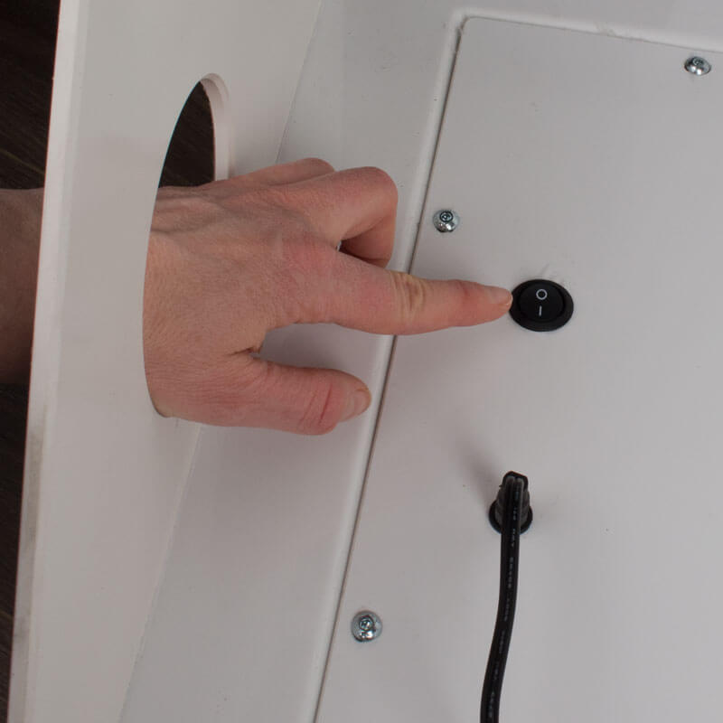 Für die Beleuchtung benötigen Sie eine Steckdose (Kabellänge ca. 190cm) . Der An-Aus-Schalter befindet sich an der schrägen Unterseite der Flaschentreppe. Um mit den Fingern an den Schalter zu gelangen, ist in eine Seitenwand ein Loch gesägt (10,3cm Durchmesser). Die Treppe ist so konzipiert, dass sie das Loch entweder an der linken oder an der rechten Seite platzieren können. So haben Sie maximale Freiheit beim Aufstellen.