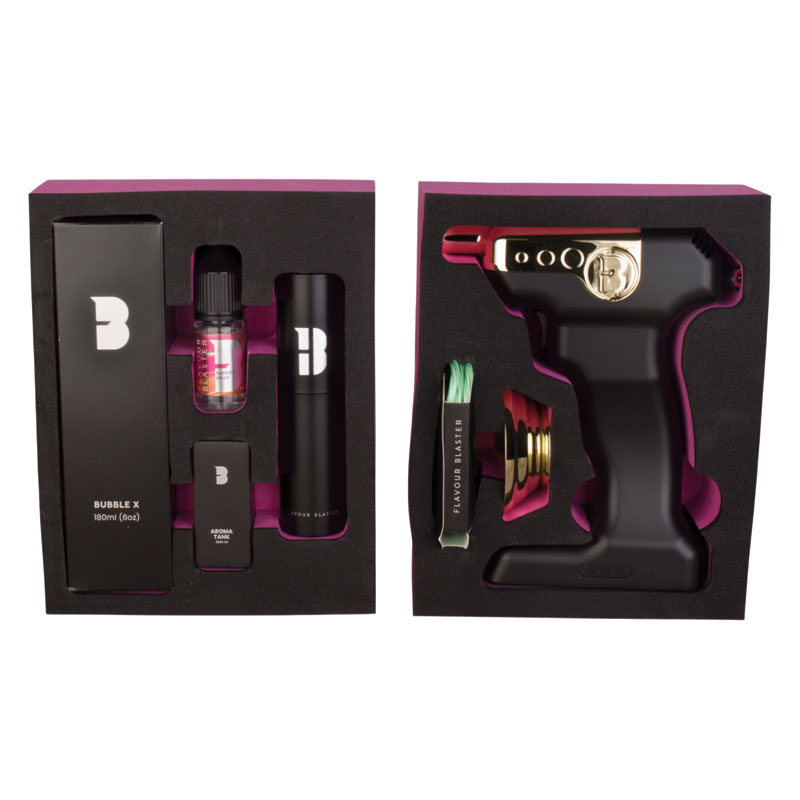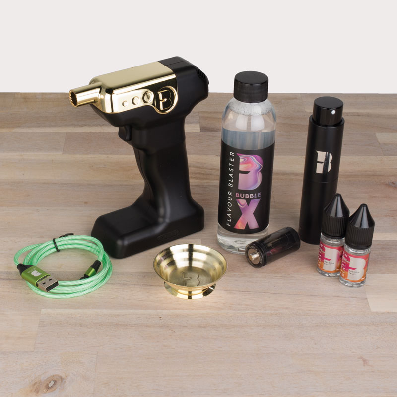 Mit dem Flavour Blaster Mini zaubern Sie Aroma-gefüllte Blasen und aromatisierte Dampfwolken auf Cocktails und Desserts. Das Flavour Blaster Kit Mini enthält neben dem Gerät auch eine Flasche mit Bubble X, der essbaren Flüssigkeit, aus welcher die Blasen geformt werden. Außerdem gehören 2 Fläschchen mit Aroma, ein Aroma-Tank, ein Schälchen für Bubble X, eine Sprühflasche und ein Ladekabel (USB-C) zum Set.