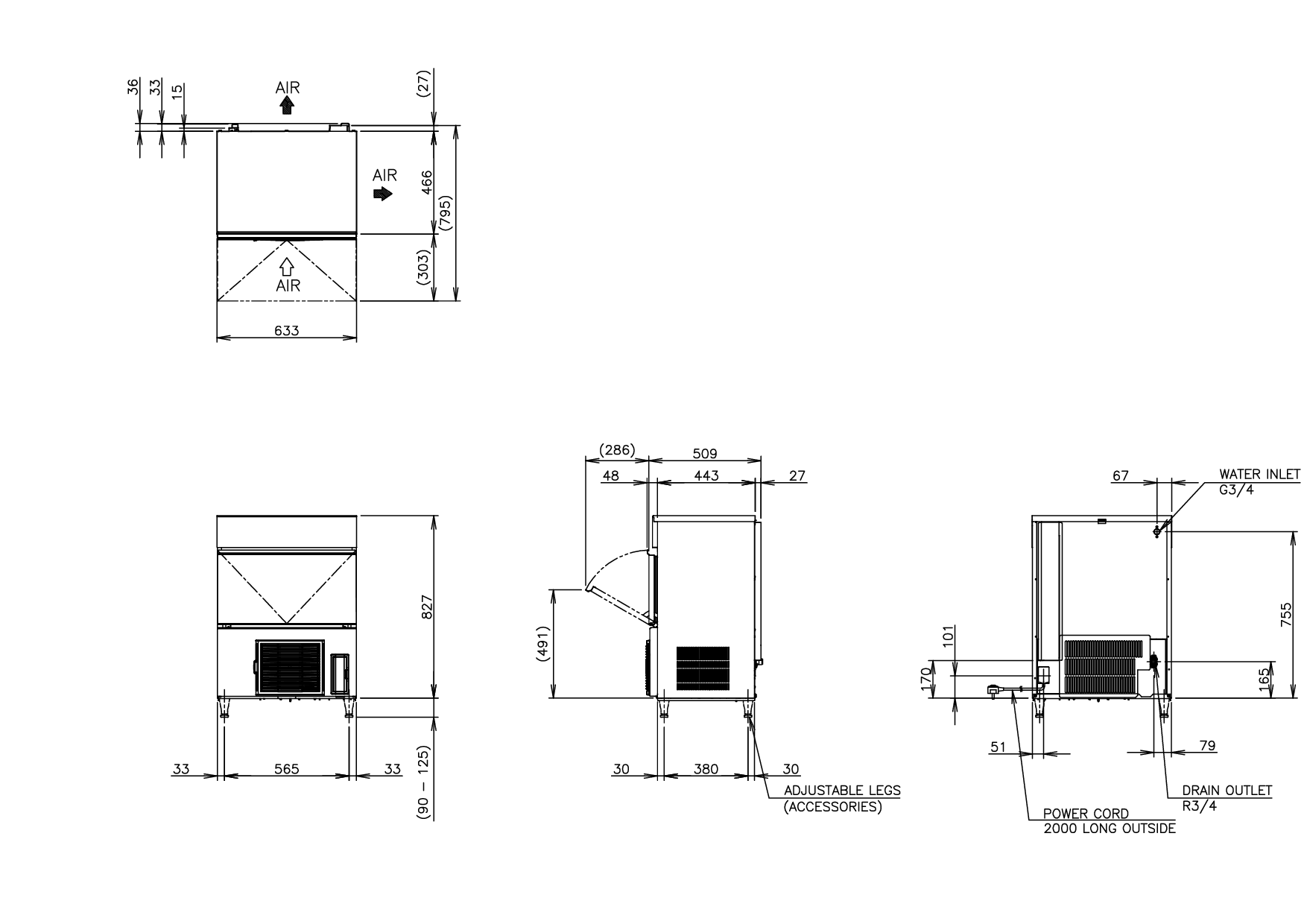 Abmessungen: 633 x 506 x 840mm (Zuzüglich der Füße 90-125mm)