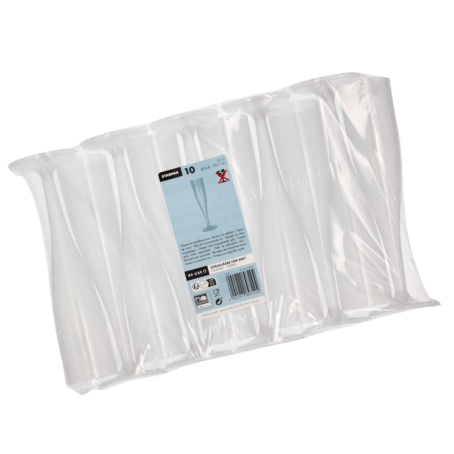 Mit diesen Sektgläsern aus Kunststoff sind Sie bestens für die nächste Silvesterparty, Geburtstagsfeier und sogar Festivals ausgestattet. Die spülmaschinengeeigneten Sektflöten sind unzerbrechlich, stabil und wiederverwendbar. Ein 0,1l Füllstrich erleichtert das genaue Einschenken der typischen Menge Sekt. Das verwendete Polypropylen ist transluzent, also durchscheinend, aber nicht klar.