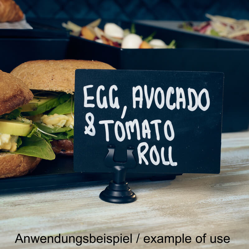 •Aus rostfreiem Stahl •Mit schwarzer Beschichtung •Schwerer Standfuß für Stabilität •Ideal für Preis, Tischnummern, Mitteilungen, Menüs oder spezielle Informationen und Werbeaktionen •Für die Verwendung mit kleinen laminierten Kartenmenüs