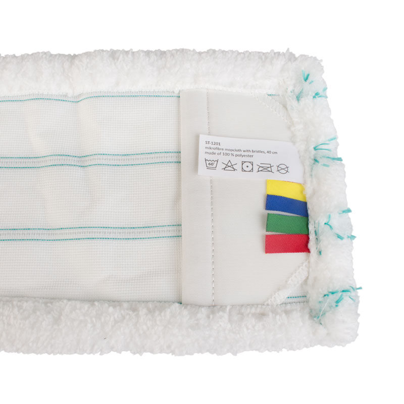 Dieser Mikrofaser-Wischmopp aus Polyester hat weiche Zusatzborsten, um die Reinigungswirkung zu verstärken. Mit den beidseitigen Taschen wird der Mikrofasermopp in einen passenden Mopp-Halter eingespannt (gängige Halter bis 12,5 cm Breite). Für verbesserte Hygiene in professionellen Umgebungen verfügt der Wischmopp über kleine Fahnen in 4 Farben, welche die farbkodierte Reinigung erleichtern.