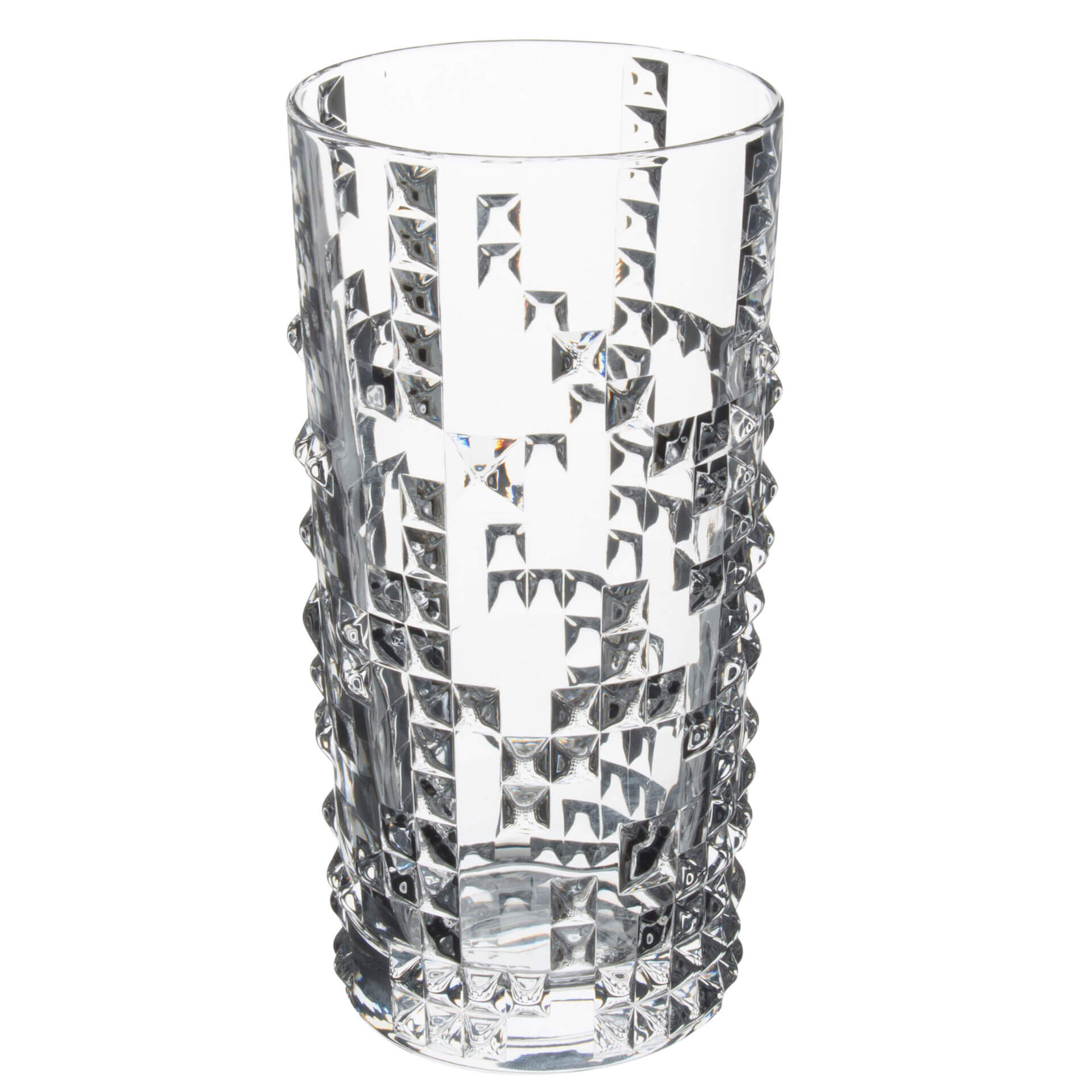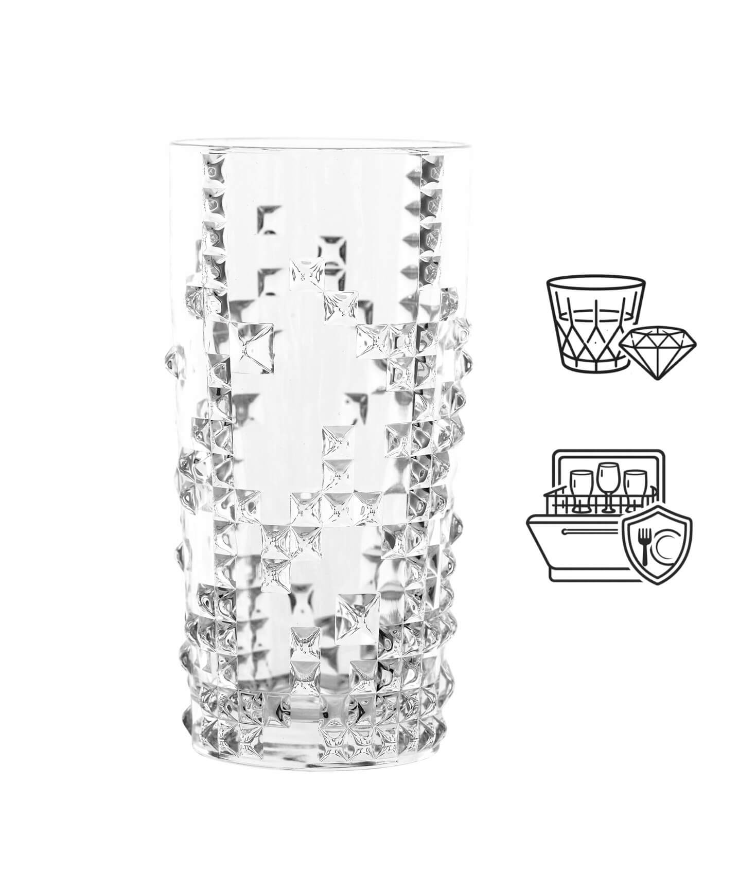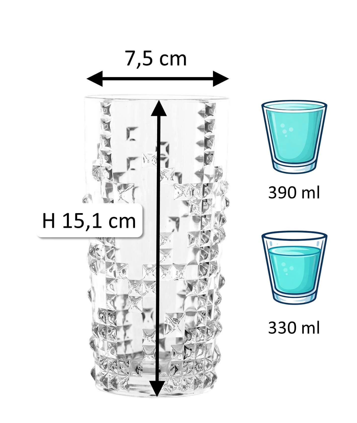 Das Longdrinkglas ist mit 390ml Fassungsvermögen sehr großzügig, sodass auch Drinks, die mit viel Eis gekühlt werden, Platz darin finden. Das Design hat es in sich: Aus der Oberfläche brechen gläserne Nieten in einem gitteratigen Muster hervor. Das ist nicht nur ein Hingucker, das Glas ist auch besonders griffig und rutscht nicht aus der Hand. Der verstärkte Boden schenkt eine angenehme Schwere, obwohl er trotzdem eher flach ist.