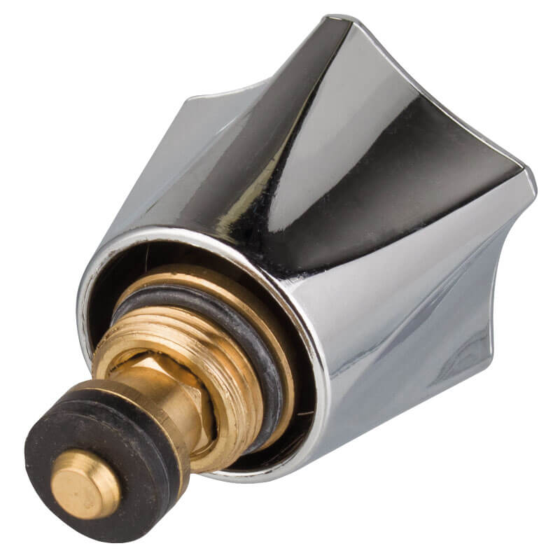 Dieses Oberteil für Mischbatterien hat einen 3/8 Zoll Anschluss. Der Drehknauf für den Unterspülhahn ist mit einem blauen Punkt in der Mitte versehen, was die Kennzeichnung für Kaltwasserhähne ist.