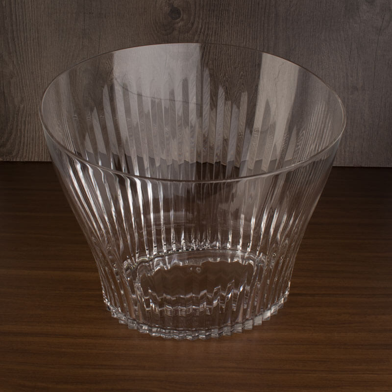 Der Sektkühler Glory ist von Kristallglas-Design inspiriert, besteht aber aus bruchsicherem Acrylglas. Hier bekommen Sie also eine gelungene Mischung aus Ästhetik und Funktionalität. In den Flaschenkühler passen bis zu 4 Sektflaschen mit Eis. Das Muster aus senkrechten Linien ist im unteren Teil des Sektkühlers tief eingeprägt, wird nach oben hin aber immer dünner, bis es am Rand ganz verschwindet. Der Sektkühler hat einen geschwungenen Rand und ist zwischen 21,5 cm und 30 cm hoch.