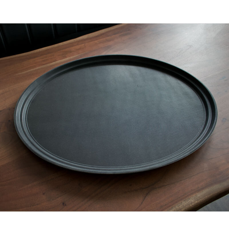 Dieses große Serviertablett besteht aus schwarzem Fiberglas mit einer rutschfesten Oberseite. Das schwarze Tablett ist oval und misst an der langen Seite bis zu 73,5cm und an der schmalen Seite maximal 60cm. Damit ist das anti-rutsch Tablett besonders groß und eignet sich zum Beispiel für Biergärten, Großveranstaltungen und alles, wo schnell große Mengen Speisen und Getränke an die Tische gebracht und Geschirr abgeräumt werden muss.