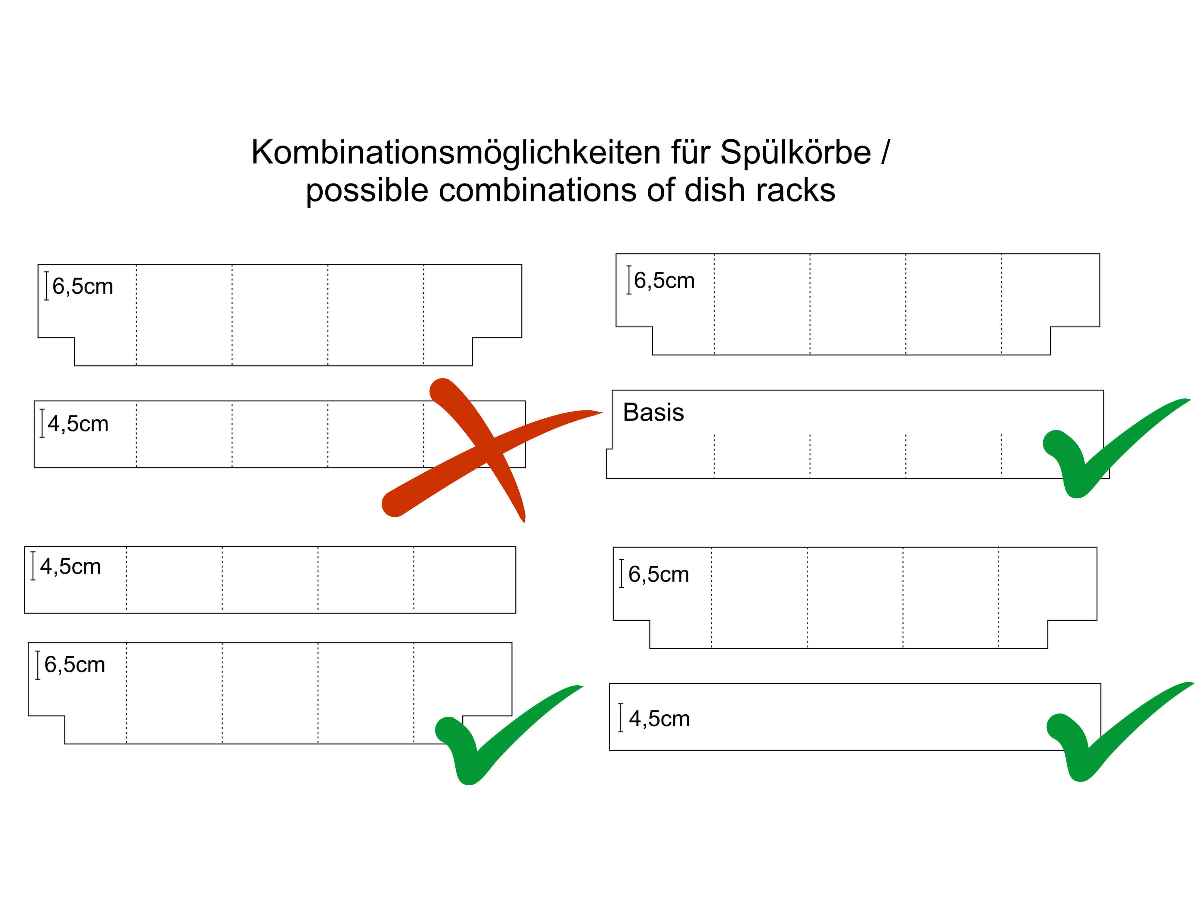Der Basiskorb bietet Platz für 25 Gläser. Er hat eine Höhe von 10,3cm, wobei die einzelnen "Fächergrenzen" Schutz für Gläser mit einer maximalen Höhe von 7,5cm bieten. Sollten Sie höhere Gläser spülen wollen, empfehlen wir Ihnen eine Erweiterung. Wählen Sie dabei aus 3 verschiedenen Aufsätzen. Der Korb hat weiterhin eine Breite und Länge von je 50,0cm.