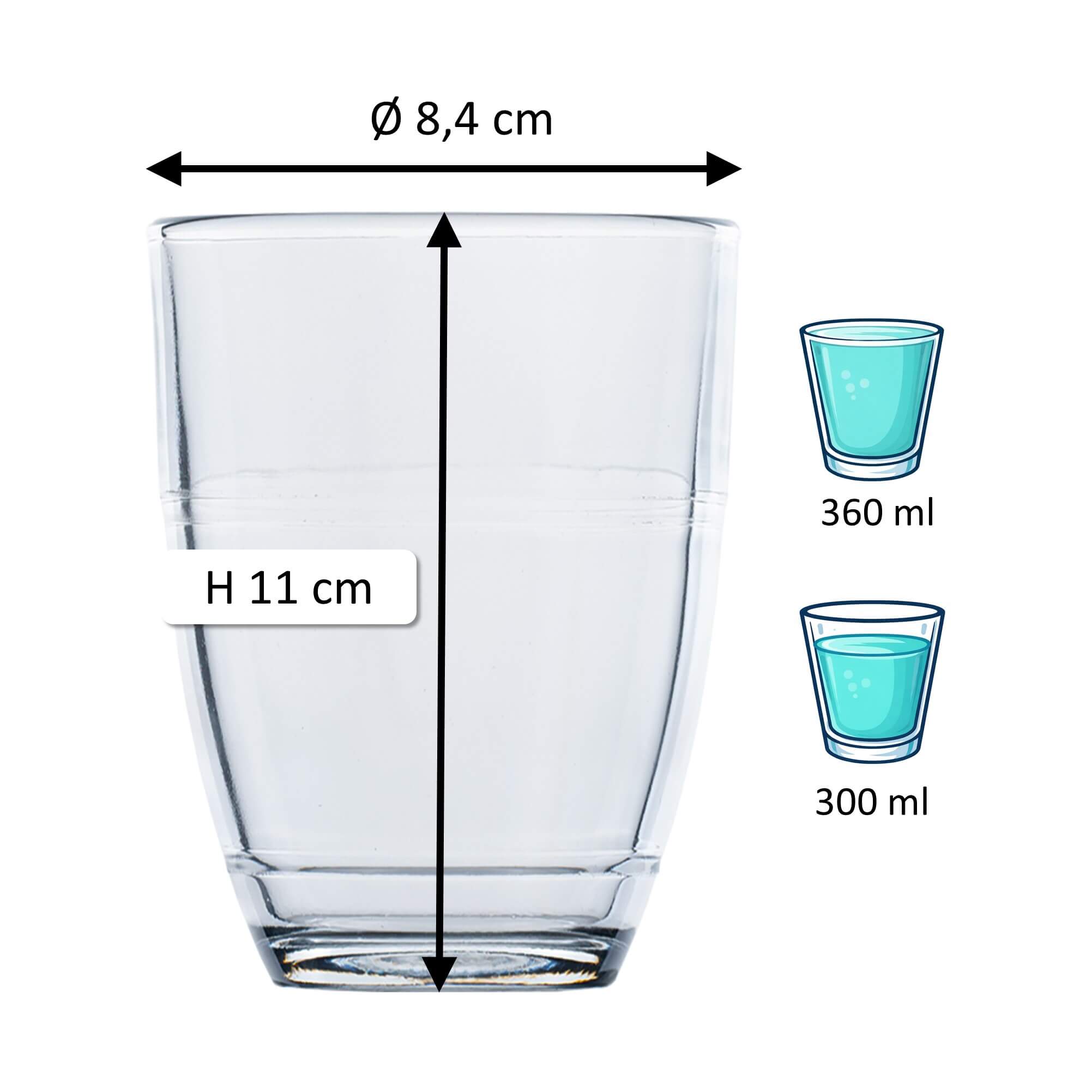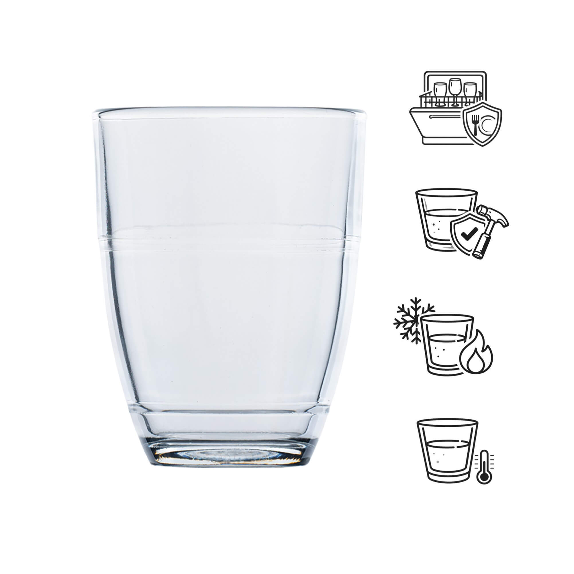 Bis zum Rand gefüllt fasst der Gigogne Stapelbecher 360ml. Das stapelbare Glas ist damit genau richtig für 0,3l Getränke mit Eis oder Schaum. Nutzen Sie diese Design-Ikone von Duralex zum Beispiel für Longdrinks, Softdrinks, Eiskaffee oder Heißgetränke.