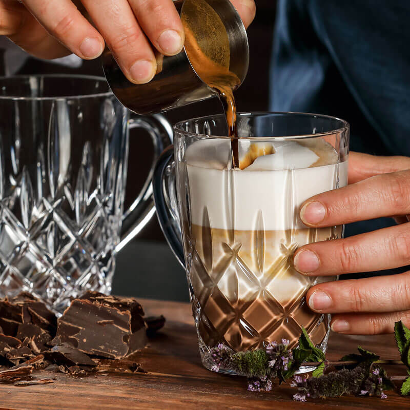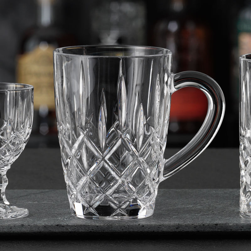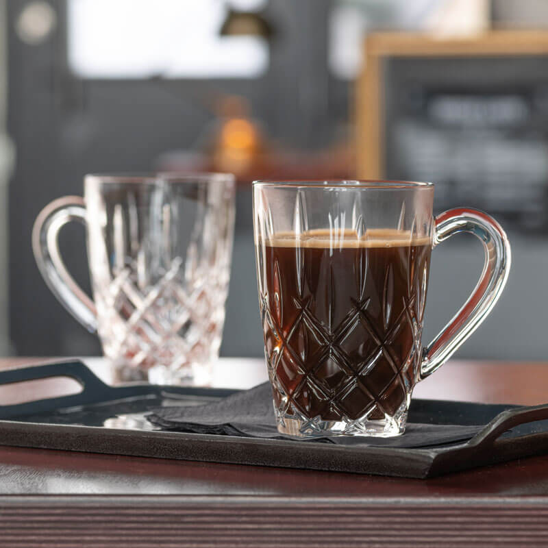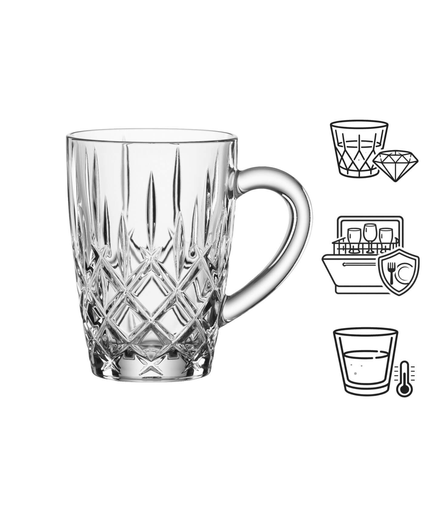 Der Teebecher aus der markanten Serie "Noblesse" trägt das aufregende Muster aus Rauten und langen Rillen, in denen sich Licht bricht und das Glas so zum Funkeln bringt. Zusätzlich ist der Becher mit einem bauchigen Henkel ausgestattet, der weit vom Becher weg ragt. So können Heißgetränke ohne Probleme sicher gehalten werden.