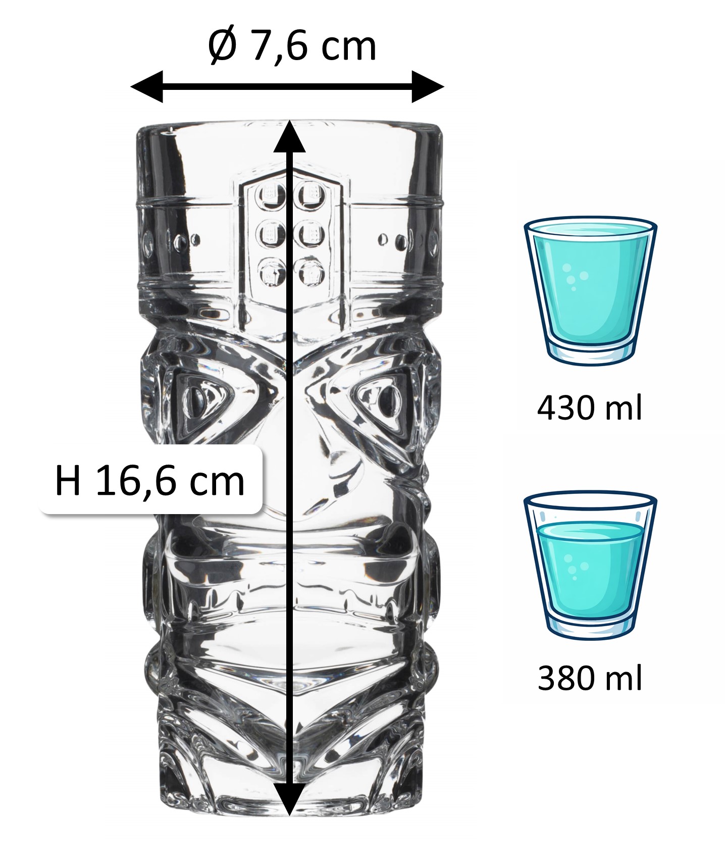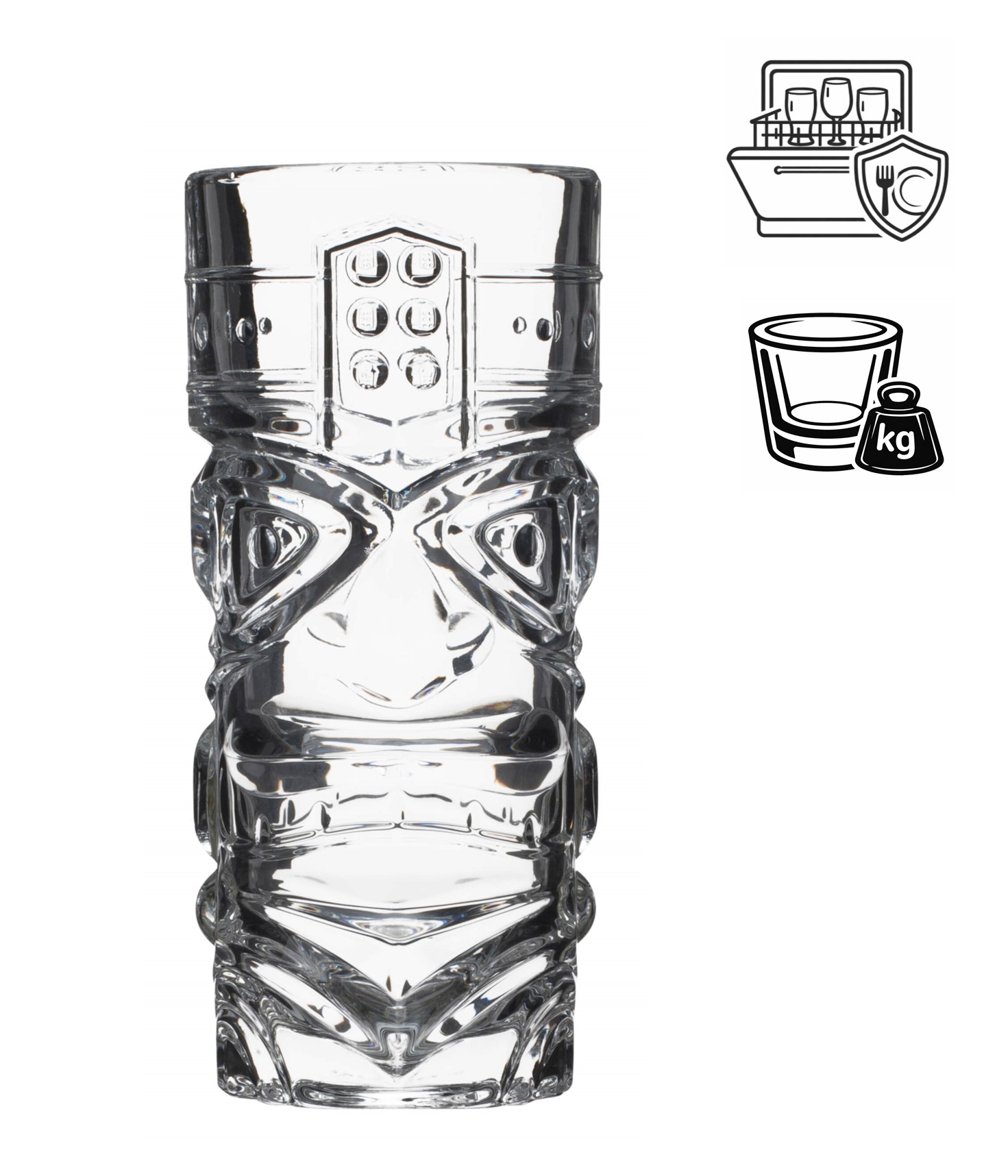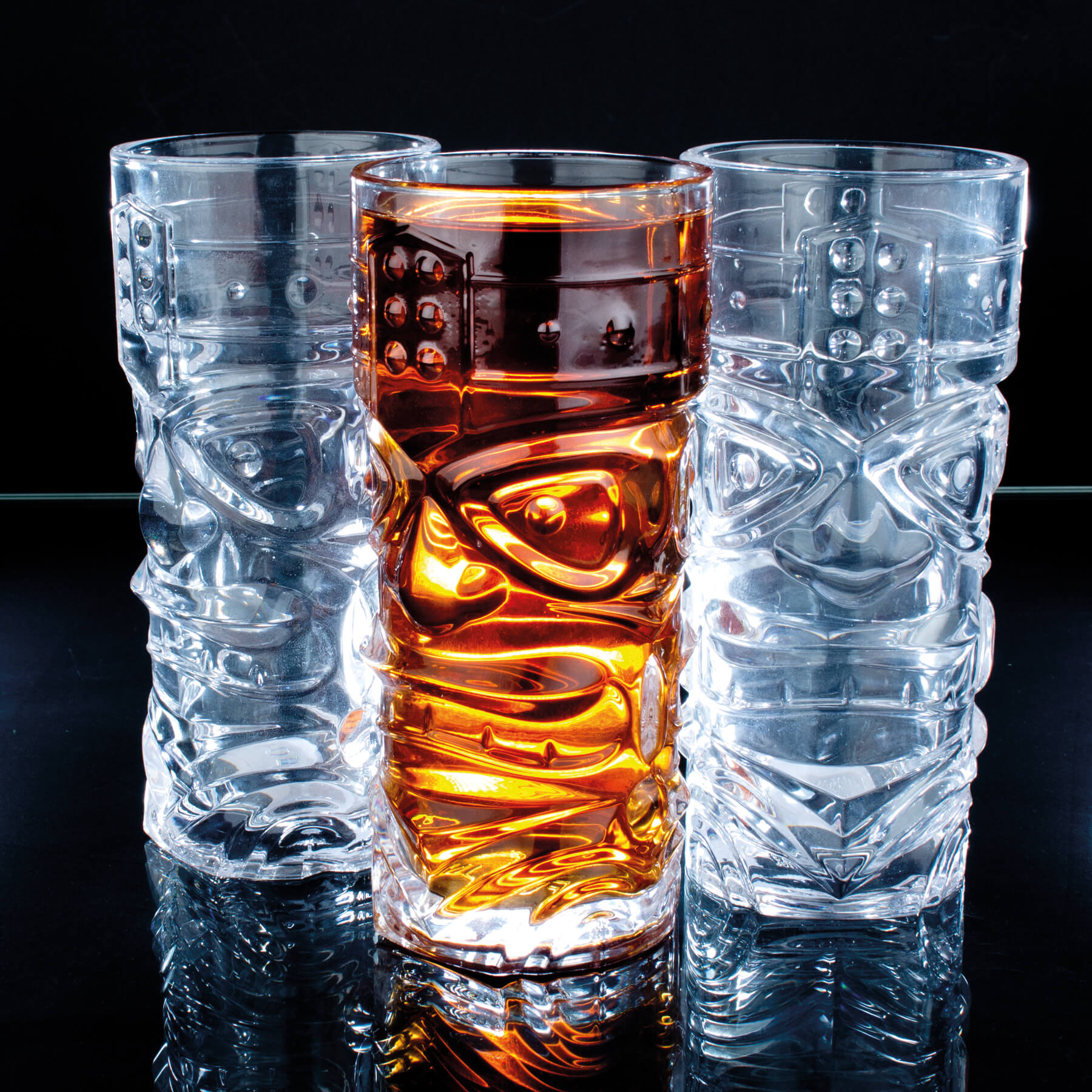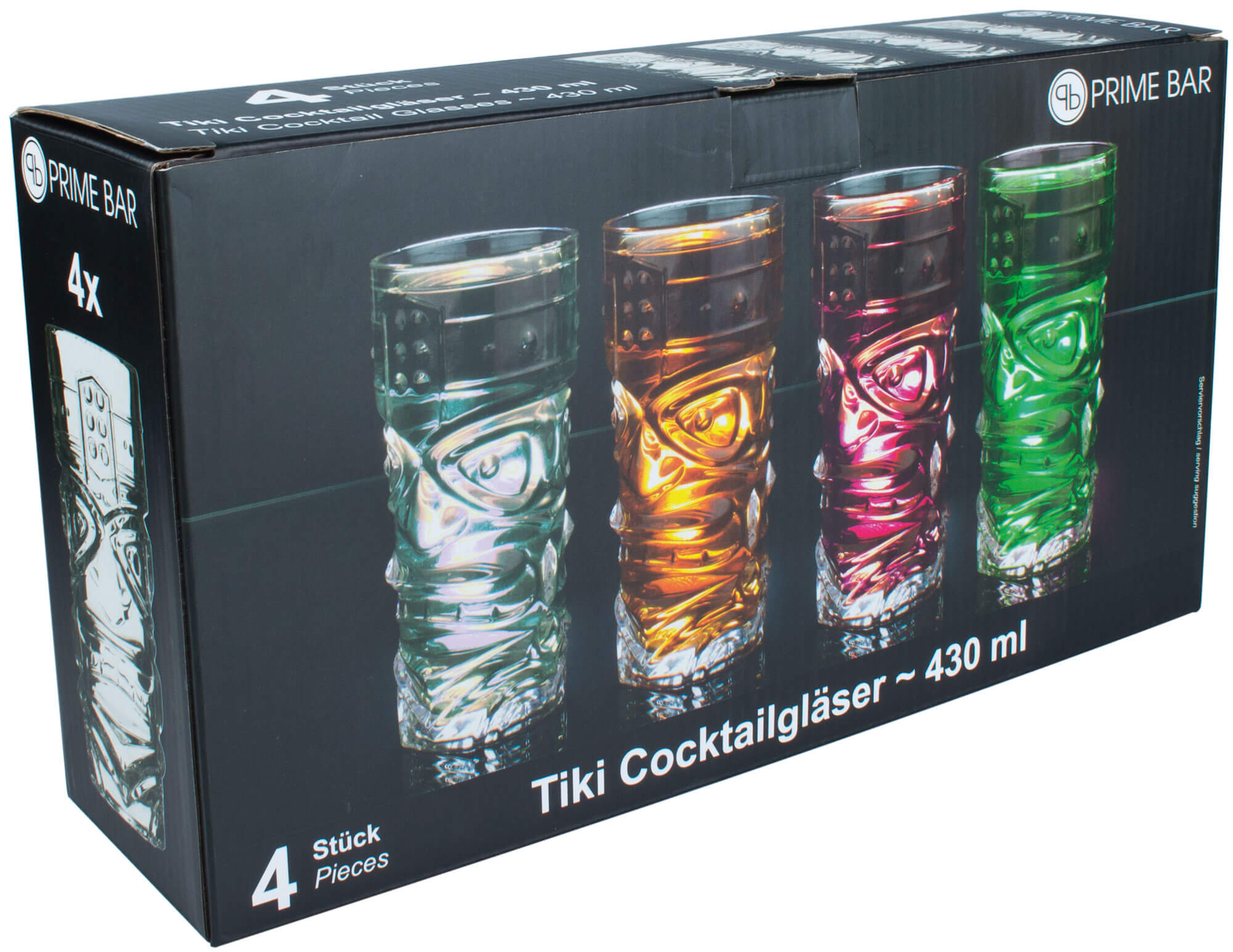Die Tiki Hi-Ball Becher von Prime Bar haben je ein Gesicht auf der Vorder- und Rückseite. Durch Einfüllen intensiv-bunter Getränke werden die Konturen der Tiki Götter sichtbar. Das zylindrische Glas ist 16,6cm hoch und bietet ein Volumen von 430ml bei einem Durchmesser von ca. 7,6cm.