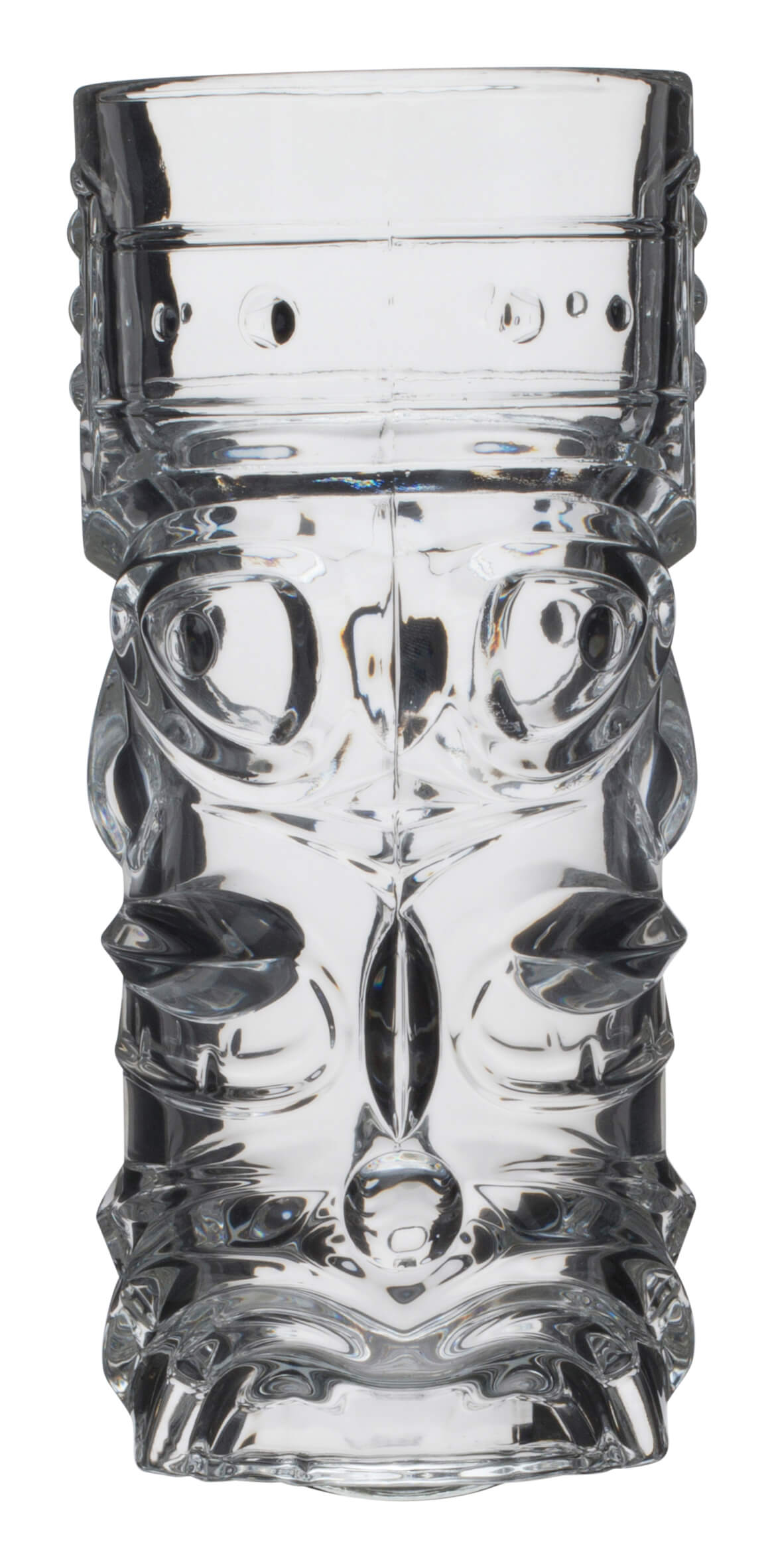 Prime Bar hat mit diesem Hi-Ball Tiki ein gläsernes Abbild eines gekrönten, wilden Tiki-Gotts geschaffen. Ein Gesicht ist auf Vorder- und Rückseite zu sehen.