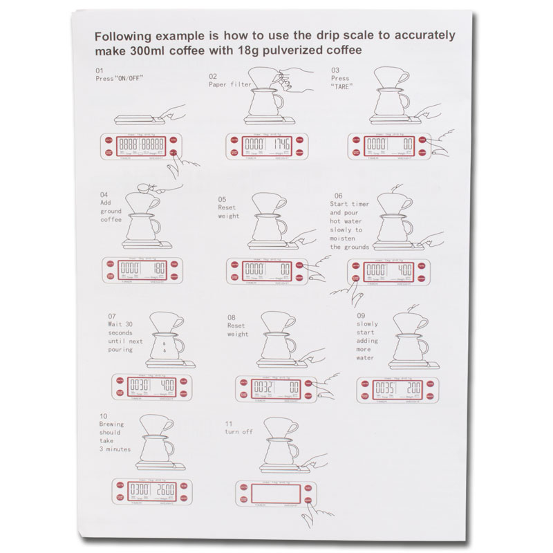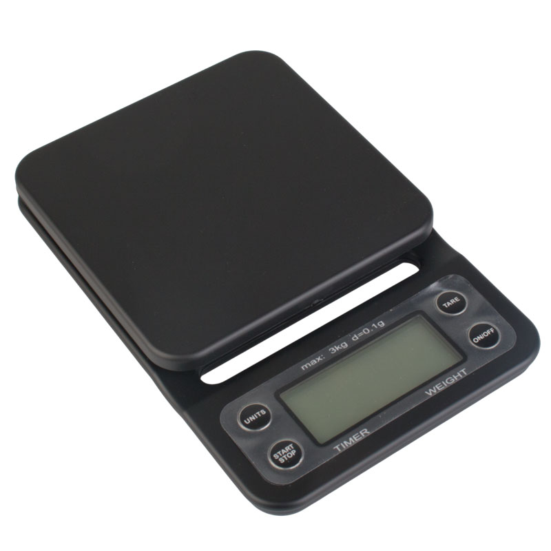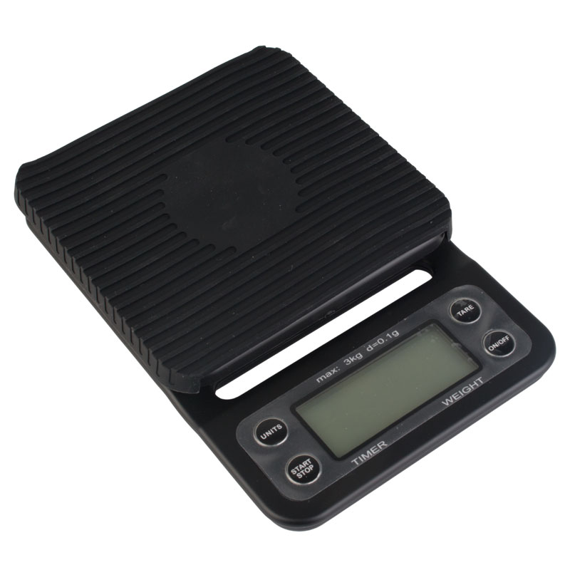 Diese schwarze Digitalwaage misst bis zu 3 kg mit einer Genauigkeit von 0,1 g und Sie können zwischen den Maßeinheiten g/ml, oz und Lb wählen. Der integrierte Timer ist besonders für die genaue Zubereitung von Kaffee mit einem Handfilter wichtig. Timer und Gewicht werden gleichzeitig angezeigt. Das Display ist hintergrundbeleuchtet. Zum Set gehört auch eine Silikonmatte, die auf die Waagebasis bespannt werden kann. So wird die Tropfwaage vor überlaufender Flüssigkeit geschützt und das Gefäß steht rutschfest.